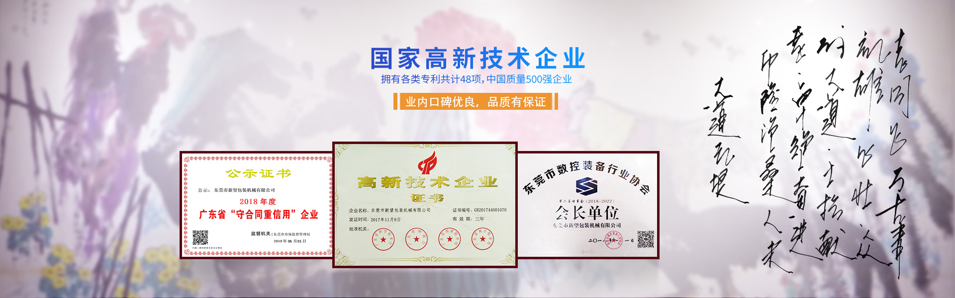 新望機械成立于1998年,位于東莞市東部工業園區的中心地帶——企石鎮東平村,交通方便、環境優美舒適、視野開闊。公司注冊資本2000萬元,擁有辦公室、廠房等18,000多平方米。已通過ISO9001:2008國際質量管理體系認證,擁有國家各類專利共計58項。是東莞市企石鎮工商聯副會長單位、東莞市企石鎮文學藝術界聯合會副主席單位、東莞市環保包裝行業協會副會長單位、東莞市數控裝備行業協會第二屆會長單位、廣東省包裝技術協會常務理事單位、廣東省膠粘劑行業協會理事單位、廣東省著名商標企業、國家高新技術企業。